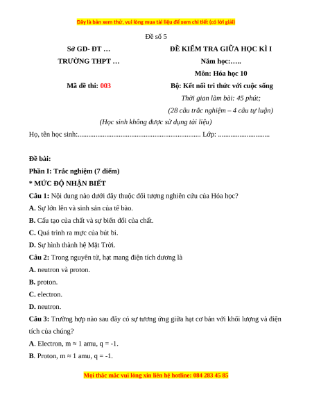ĐỀ KIỂM TRA GIỮA HỌC KÌ I TRƯỜNG THPT … Năm học:….. Môn: Hóa học 10 Mã đề thi: 003