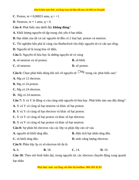 Câu 6: Chọn phát biểu đúng khi nói về nguyên tử trong các phát biểu sau? A. Mg có 12 electron. B. Mg có 24 proton. C. Mg có 24 electron. D. Mg có 24 neutron.