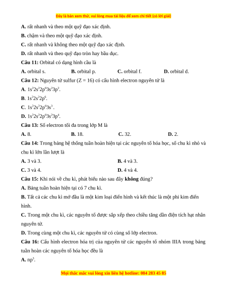 Câu 9: Phân lớp 3p có số electron tối đa là A. 6. B. 18. C. 14. D. 10.
