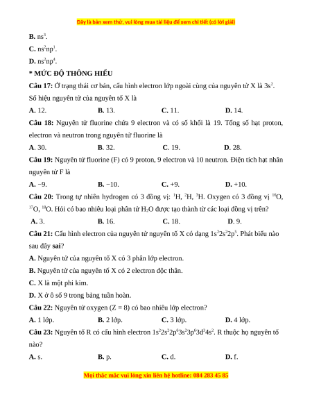 Câu 17: Ở trạng thái cơ bản, cấu hình electron lớp ngoài cùng của nguyên tử X là 3s
