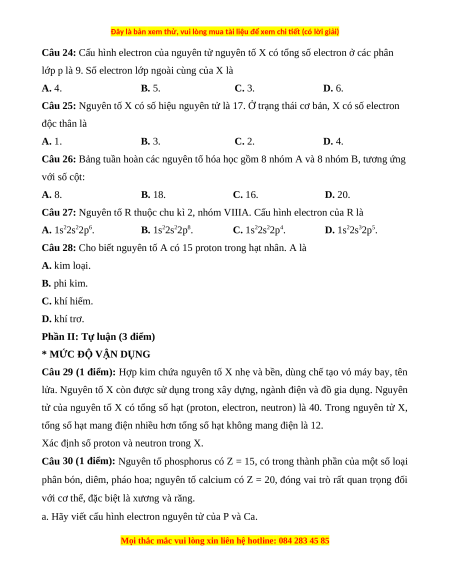 Câu 24: Cấu hình electron của nguyên tử nguyên tố X có tổng số electron ở các phân