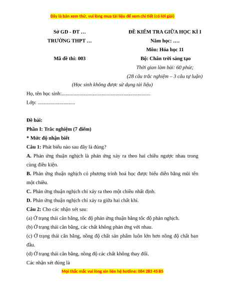 ĐỀ KIỂM TRA GIỮA HỌC KÌ I TRƯỜNG THPT … Năm học: …. Môn: Hóa học 11 Mã đề thi: 003