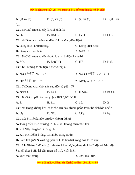 Câu 3: Chất nào sau đây là chất điện li? A. O2. B. HNO3. C. CuO. D. CH4.