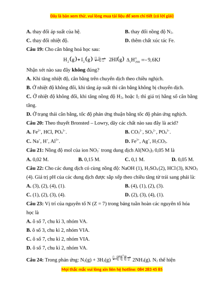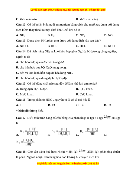 Câu 18: Cho cân bằng hoá học: N2 (g) + 3H2 (g)