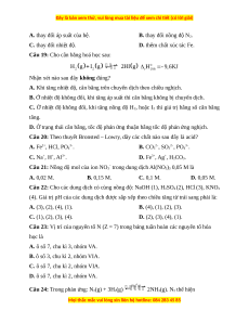 Câu 20: Theo thuyết Bronsted – Lowry, dãy các chất nào sau đây là acid? A. Fe2+, HCl, PO 3− 2− 2− 3− 4 . B. CO3 , SO3 , PO4 . C. Na+, H+, Al3+. D. Fe3+, Ag+, H2CO3.