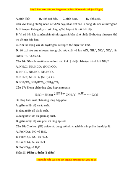 Câu 24: Trong phản ứng: N2(g) + 3H2(g) 2NH3(g). N2 thể hiện