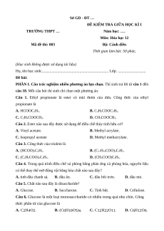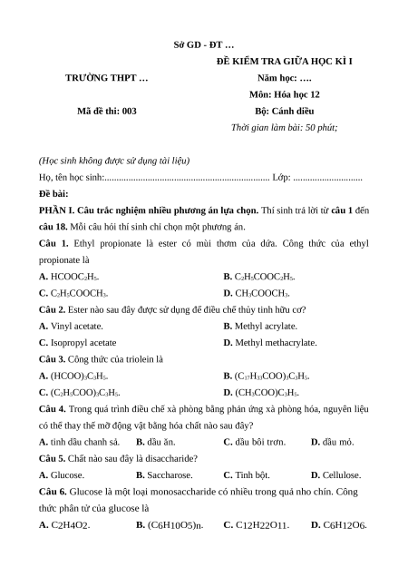 ĐỀ KIỂM TRA GIỮA HỌC KÌ I TRƯỜNG THPT … Năm học: …. Môn: Hóa học 12 Mã đề thi: 003 Bộ: Cánh diều