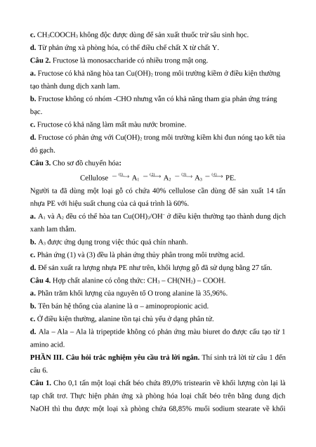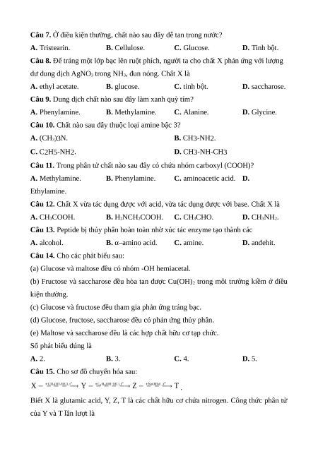 Câu 7. Ở điều kiện thường, chất nào sau đây dễ tan trong nước? A. Tristearin. B. Cellulose. C. Glucose. D. Tinh bột.