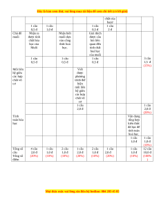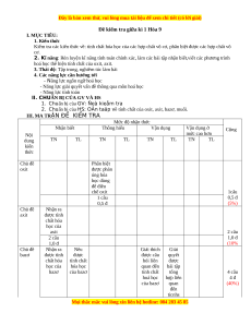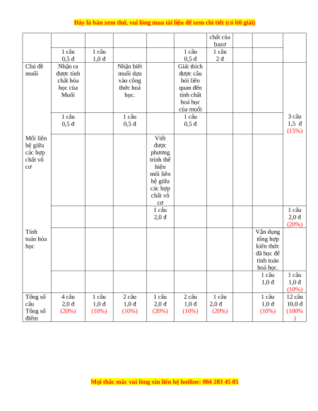 chất của bazơ 1 câu 1 câu 1 câu 1 câu 0,5 đ 1,0 đ 0,5 đ 2 đ Chủ đề Nhận ra Nhận biết Giải thích muối được tính muối dựa được câu chất hóa vào công hỏi liên học của thức hoá quan đến Muối học. tính chất hoá học của muối 1 câu 1 câu 1 câu 3 câu 0,5 đ 0,5 đ 0,5 đ 1,5 đ (15%) Mối liên Viết hệ giữa được các hợp phương chất vô trình thể cơ hiện mối liên hệ giữa các hợp chất vô cơ 1 câu 1 câu 2,0 đ 2,0 đ (20%) Tính Vận dụng toán hóa tổng hợp học kiến thức đã học để tính toán hoá học. 1 câu 1 câu 1,0 đ 1,0 đ (10%) Tổng số 4 câu 1 câu 2 câu 1 câu 2 câu 1 câu 1 câu 12 câu câu 2,0 đ 1,0 đ 1,0 đ 2,0 đ 1,0 đ 2,0 đ 1,0 đ 10,0 đ Tổng số (20%) (10%) (10%) (20%) (10%) (20%) (10%) (100% điểm )
