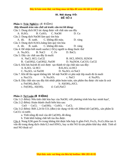 Câu 1: Dung dich HCl tác dụng được với chất nào sau đây A. H2SO4 B. CuSO4 C. NaOH D. Cu