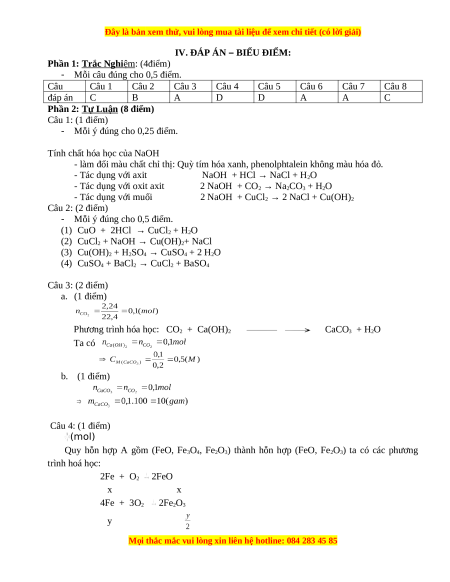 IV. ĐÁP ÁN – BIỂU ĐIỂM: