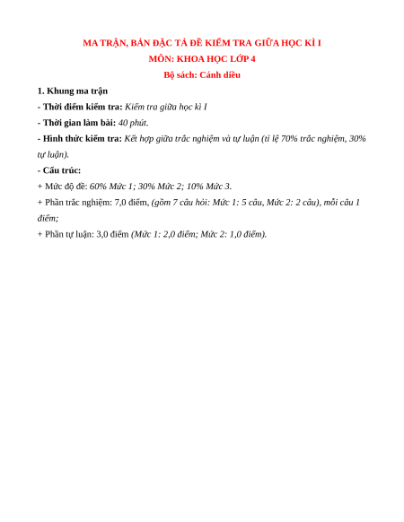 - Tailieugiaovien.com.vn giới thiệu 2 đề giữa kì 1 gồm đầy đủ ma trận và lời giải chi tiết môn Khoa học lớp 4 Cánh diều mới nhất năm 2023 nhằm giúp Giáo viên có thêm tài liệu tham khảo ra đề thi Khoa học lớp 4.