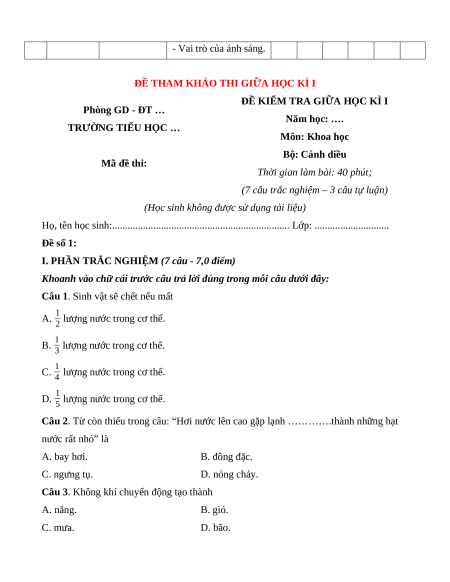 TRƯỜNG TIỂU HỌC … Môn: Khoa học Bộ: Cánh diều Mã đề thi: