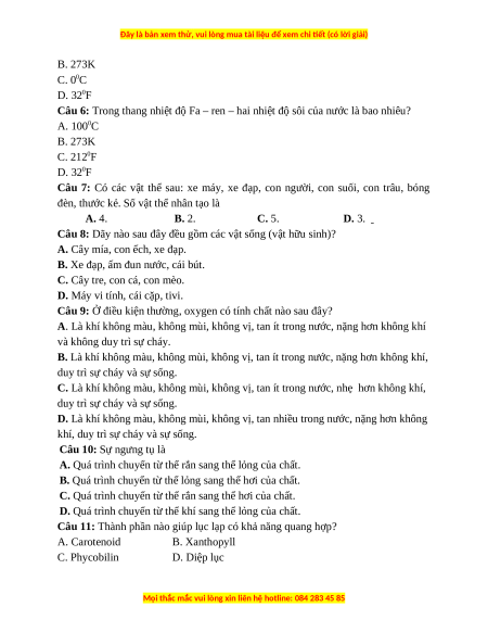 Câu 6: Trong thang nhiệt độ Fa – ren – hai nhiệt độ sôi của nước là bao nhiêu? A. 1000C B. 273K C. 2120F D. 320F