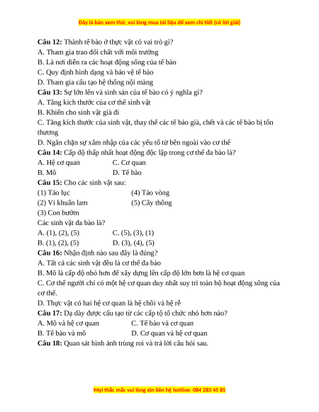 Câu 14: Cấp độ thấp nhất hoạt động độc lập trong cơ thể đa bào là? A. Hệ cơ quan C. Cơ quan B. Mô D. Tế bào