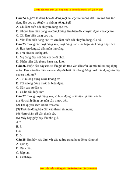 Câu 24. Người ta dùng búa để đóng một cái cọc tre xuống đất. Lực mà búa tác