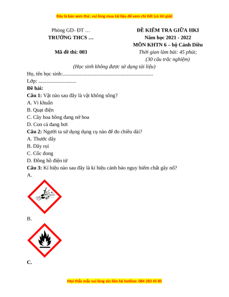 MÔN KHTN 6 – bộ Cánh Diều Mã đề thi: 003