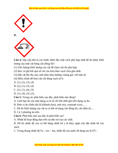 Câu 4: Sắp xếp thứ tự các bước dưới đây một cách phù hợp nhất để đo được khối