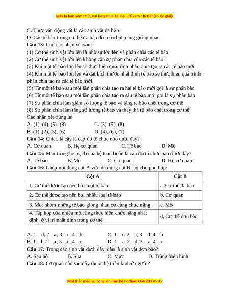 Câu 15: Máu trong hệ mạch của hệ tuần hoàn là cấp độ tổ chức nào dưới đây? A. Tế bào B. Mô C. Cơ quan D. Hệ cơ quan