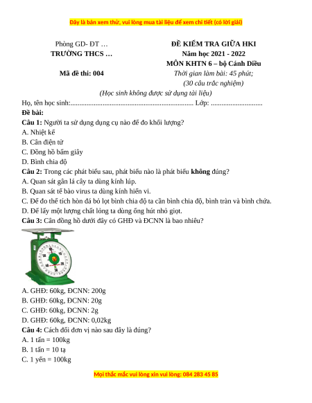 MÔN KHTN 6 – bộ Cánh Diều Mã đề thi: 004