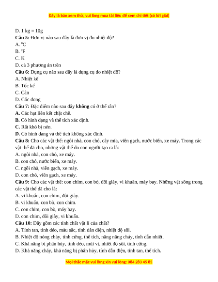 Câu 5: Đơn vị nào sau đây là đơn vị đo nhiệt độ? A. 0C B. 0F C. K D. cả 3 phương án trên
