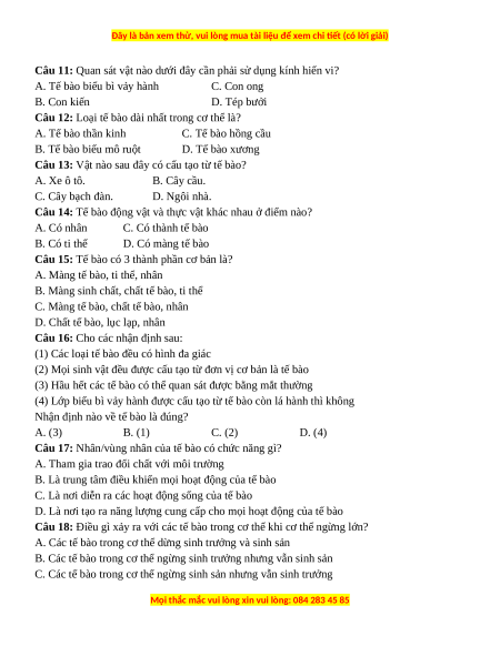 Câu 13: Vật nào sau đây có cấu tạo từ tế bào? A. Xe ô tô. B. Cây cầu. C. Cây bạch đàn. D. Ngôi nhà.
