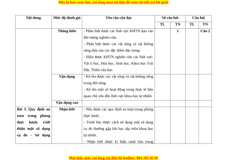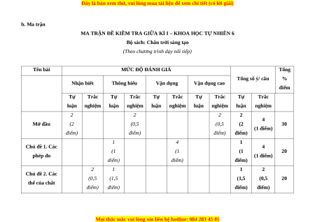 1. Khung ma trận đề kiểm tra giữa kì I môn Khoa học tự nhiên - lớp 6 a. Khung ma trận