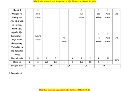 Chủ đề 3. 3 1 1 3 Oxygen và (0,75 (0,5 (0,5 (0,75 12,5 không khí điểm) điểm) điểm) điểm) Chủ đề 4. Một số vật liệu, nhiên liệu, nguyên liệu, 1 1 3 lương thực - 3 (0,75 (1 (1 (0,75 17,5 thực phẩm điểm) điểm) điểm) điểm) thông dụng; Tính chất và ứng dụng của chúng. Tổng số ý/câu 2 8 2 2 1 4 1 2 6 16 100 % Điểm số 2 2 2,5 0,5 1 1 0,5 0,5 6 4 Tổng số điểm 4,0 3,0 2,0 1,0 10 2. Bảng đặc tả