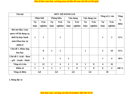 – pH – Oxide - Muối Tổng số ý/câu 1 12 1 4 1 0 1 0 4 16 Điểm số 1 3 2 1 2 0 1 0 6 4 100 % Tổng số điểm 4,0 3,0 2,0 1,0 10 2. Bảng đặc tả
