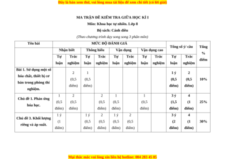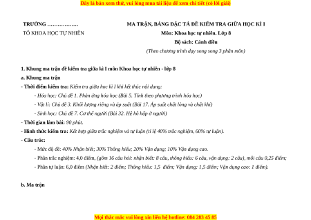 1. Khung ma trận đề kiểm tra giữa kì I môn Khoa học tự nhiên - lớp 8 a. Khung ma trận