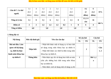 Chủ đề 7. Cơ thể (0,5 (1 (0,5 (0,5 (0,5 (0,5 (2 (1,5 35% người. điểm) điểm) điểm) điểm) điểm) điểm) điểm) điểm) 11 ý/ 4 Tổng số ý/câu 3 ý 8 3 ý 6 3 ý 2 2 ý 0 16 câu 100 % Điểm số 2 2 1,5 1,5 1,5 0,5 1 0 6 4 Tổng số điểm 4,0 3,0 2,0 1,0 10 2. Bảng đặc tả Số câu hỏi Câu hỏi Nội dung Mức độ đánh giá Yêu cầu cần đạt TL TN TL TN