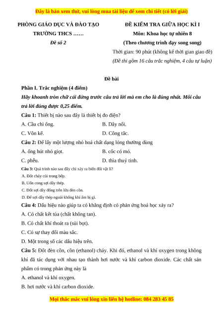 Môn: Khoa học tự nhiên 8 Đề số 2