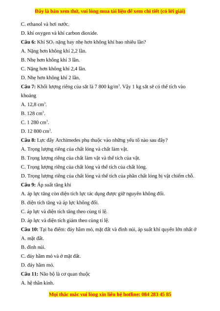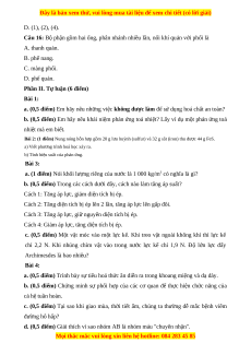 Câu 8: Lực đẩy Archimedes phụ thuộc vào những yếu tố nào sau đây?