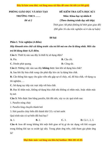 Môn: Khoa học tự nhiên 8 Đề số 2