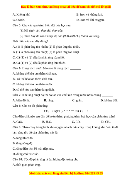 Câu 10: Tốc độ phản ứng là đại lương đặc trưng cho