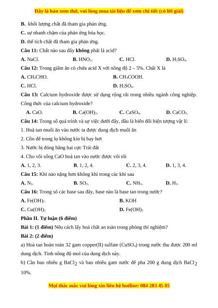 Câu 11: Chất nào sau đây không phải là acid? A. NaCl. B. HNO3. C. HCl. D. H2SO4.