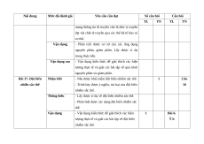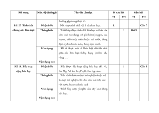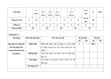 Chất và sự biến đổi 4 (1 3 ý/ 2 (1 (1 (0,5 4 35% của chất điểm) câu điểm) điểm) điểm) 1 2 1 1 4 (1 3 ý/ 2 Vật sống (0,5 (0,5 (0,5 (0,5 6 30% điểm) câu điểm) điểm) điểm) điểm) 9 ý/ 6 Tổng số ý/câu 1 12 3 4 3 0 2 0 16 câu Điểm số 1 3 2 1 2 0 1 0 6 4 Tổng số điểm 4,0 3,0 2,0 1,0 10 2. Bảng đặc tả Nội dung Mức độ đánh giá Yêu cầu cần đạt Số câu hỏi Câu hỏi TL TN TL TN