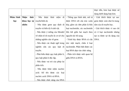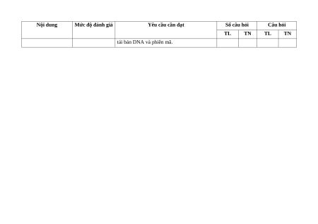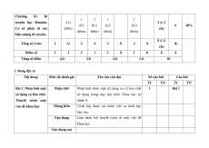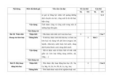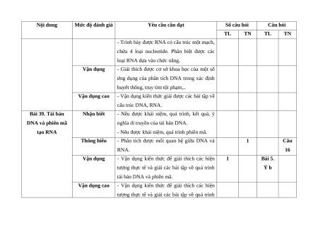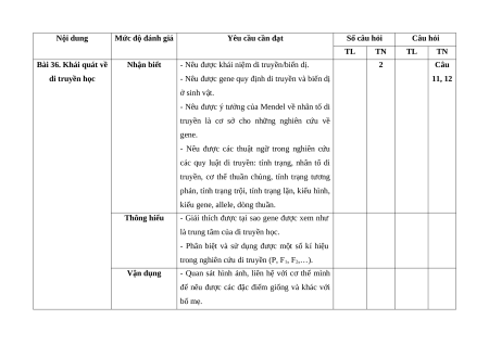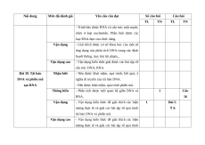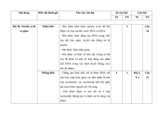 hiện tượng di truyền. 9 ý/ 6 Tổng số ý/câu 1 12 3 4 3 0 2 0 16 câu Điểm số 1 3 2 1 2 0 1 0 6 4 Tổng số điểm 4,0 3,0 2,0 1,0 10 2. Bảng đặc tả Nội dung Mức độ đánh giá Yêu cầu cần đạt Số câu hỏi Câu hỏi TL TN TL TN