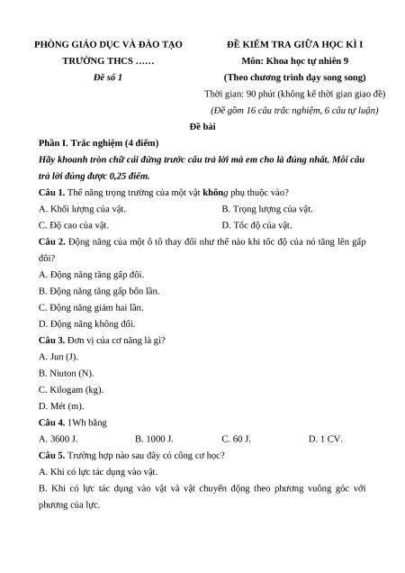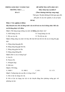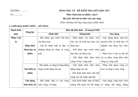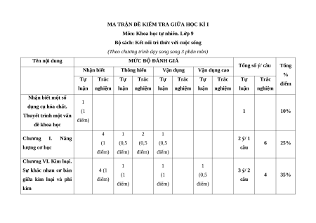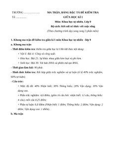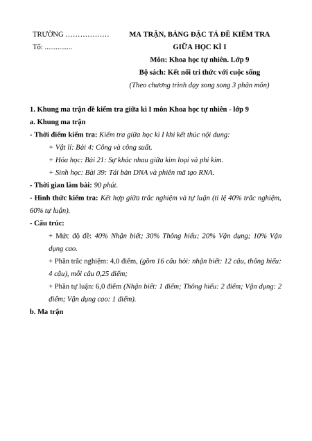 1. Khung ma trận đề kiểm tra giữa kì I môn Khoa học tự nhiên - lớp 9 a. Khung ma trận