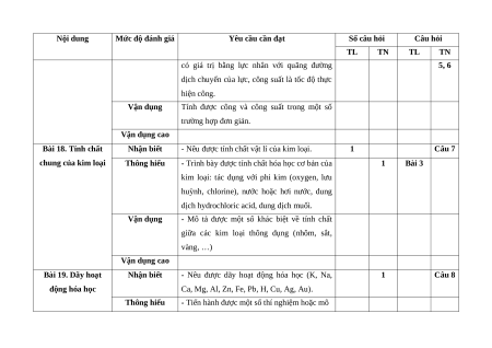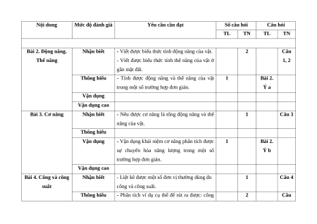 Làm được bài thuyết trình về một vấn đề khoa học. Vận dụng cao Nội dung Mức độ đánh giá Yêu cầu cần đạt Số câu hỏi Câu hỏi TL TN TL TN Bài 2. Động năng. Nhận biết