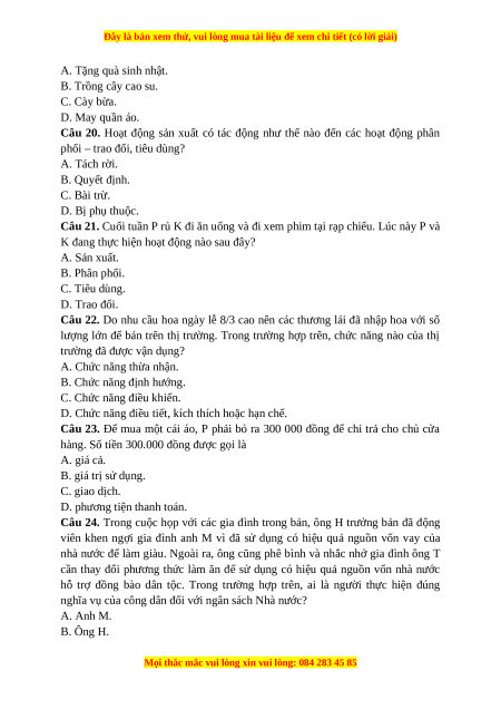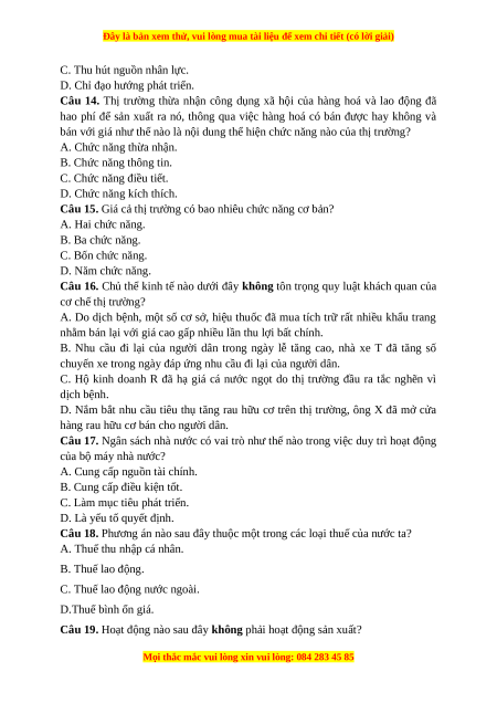 Câu 15. Giá cả thị trường có bao nhiêu chức năng cơ bản? A. Hai chức năng. B. Ba chức năng. C. Bốn chức năng. D. Năm chức năng.