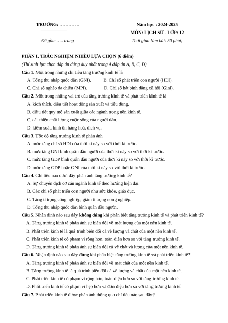 Câu 8. Yếu tố nào sau đây phản ánh sự phát triển kinh tế của một quốc gia? A. Tiến bộ xã hội. B. Tăng quy mô dân số.