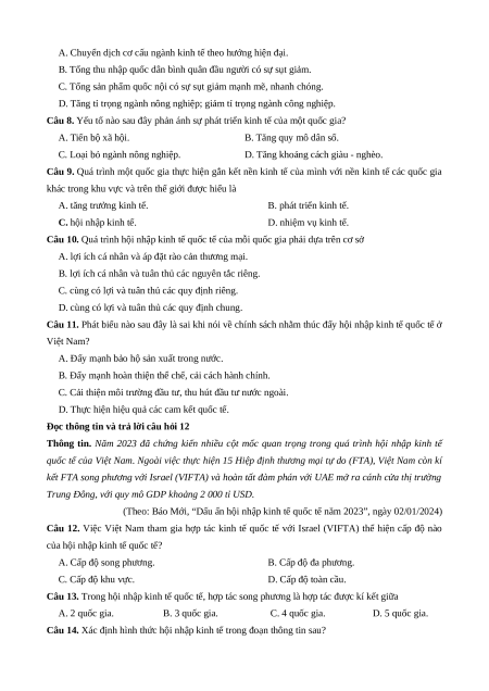 Câu 12. Việc Việt Nam tham gia hợp tác kinh tế quốc tế với Israel (VIFTA) thể hiện cấp độ nào