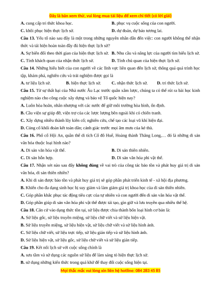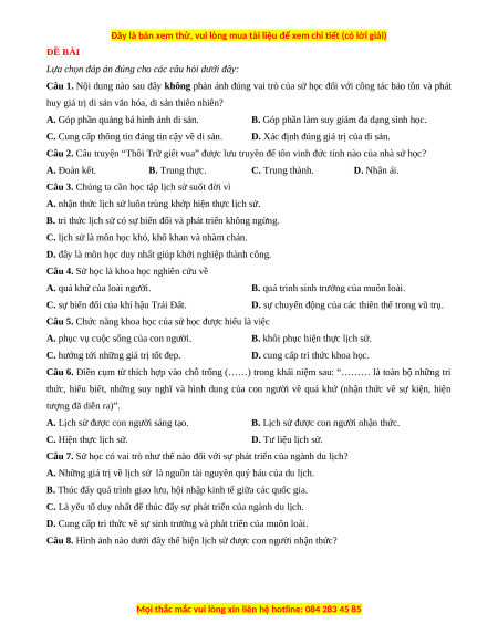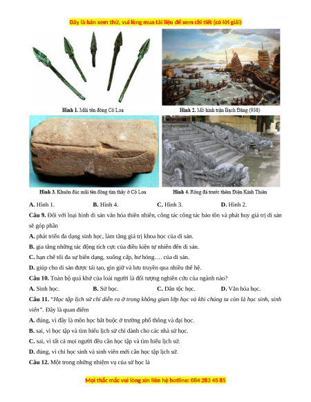 Câu 1. Nội dung nào sau đây không phản ánh đúng vai trò của sử học đối với công tác bảo tồn và phát