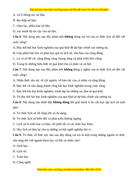 Câu 6. Nội dung nào sau đây phản ánh không đúng vai trò của tri thức lịch sử đối với cuộc sống?