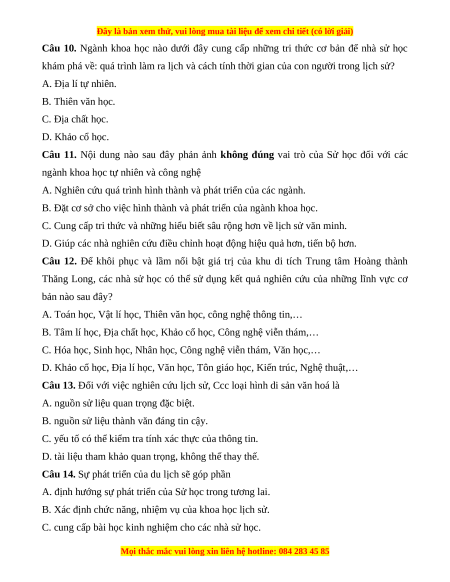 Câu 10. Ngành khoa học nào dưới đây cung cấp những tri thức cơ bản để nhà sử học