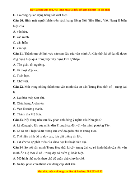 Câu 18. Thời cổ đại, ở phương Tây có 2 nền văn minh lớn là A. Ai Cập và Lưỡng Hà. B. Ấn Độ và Trung Hoa. C. Lưỡng Hà và Hy Lạp. D. Hy Lạp và La Mã.