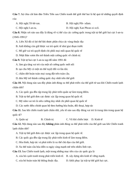 Câu 7. Sự chia cắt bán đảo Triều Tiên sau Chiến tranh thế giới thứ hai là hệ quả từ những quyết định của A. Hội nghị Tê-hê-ran. B. Hội nghị Pốt- xđam. C. Hội nghị I-an-ta.