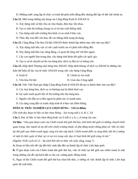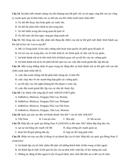 Câu 19. Hiệp hội các quốc gia Đông Nam Á (ASEAN) ra đời năm 1967 nhằm đáp ứng nhu cầu