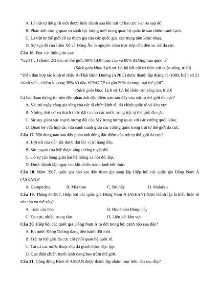 Câu 19. Tháng 8-1967, Hiệp hội các quốc gia Đông Nam Á (ASEAN) được thành lập là biểu hiện rõ nét của xu thế nào? A. Toàn cầu hóa B. Hòa hoãn Đông-Tây